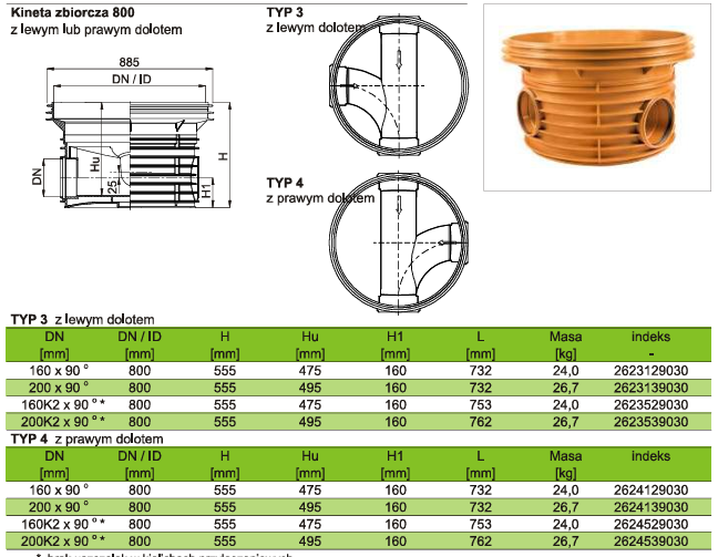 układ: przelot 180° + króciec boczny 90° z prawej strony (w kierunku spadku)